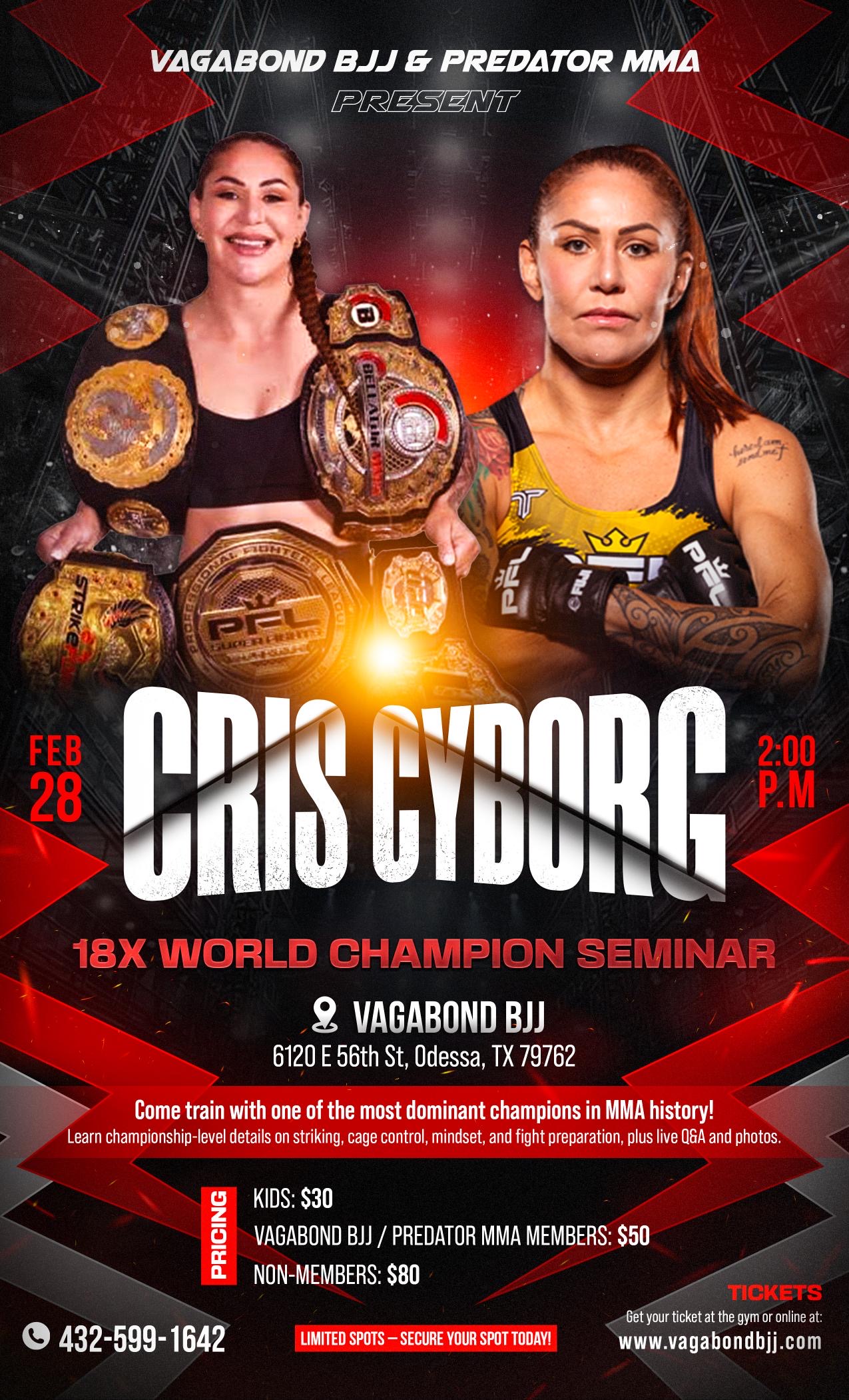 Join Cris Cyborg Saturday February 28th from 2-4PM for an MMA Seminar. Train with the 18x Mixed Martial Arts Champion as she visits VagaBond BJJ and Predator MMA in west Texas. The training will cover a wide range of skills including striking, closing the distance, securing the takedown and submission opportunities.