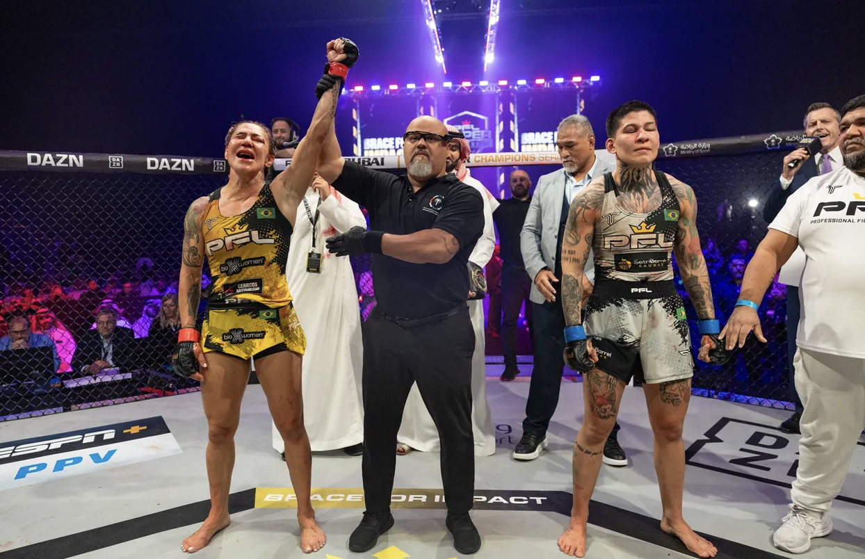 Larissa Pacheco, the only fighter to defeat Kayla Harrison is now a Free Agent. The former 2x PFL MMA Tournament Champion who won the tournament at 155lbs and 145lbs has been released by the professional fighters league. Competing against Cyborg during last years Riyadh Season event she went 5 rounds with Cyborg losing 49-46 on all three of the judges scorecards. “Professional Fighters League has released Larissa Pacheco from her Contract” PFL posted on their official PR social media before continuing with “We thank her for her memorable bouts and wish her the best in her future endeavors.”