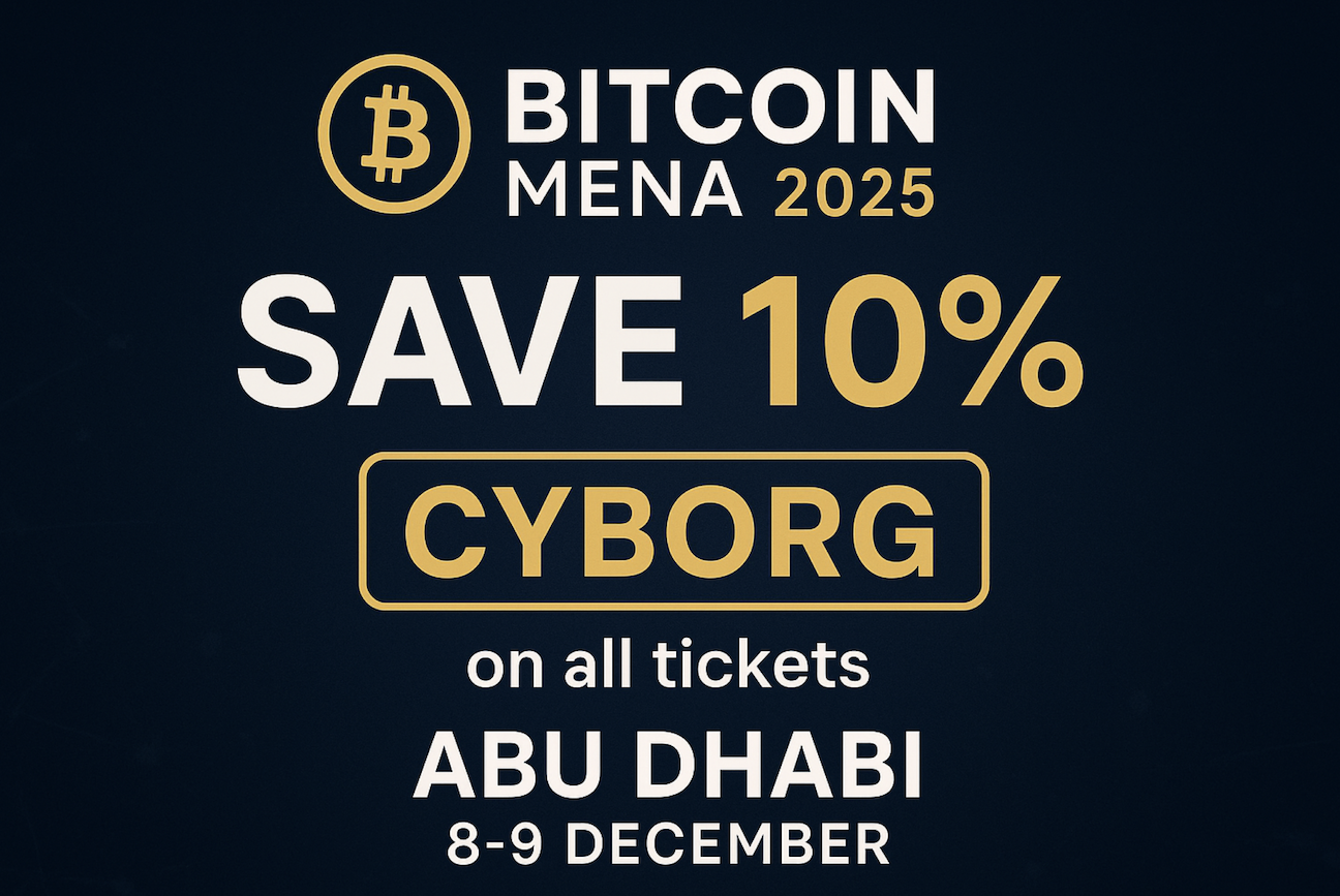 At checkout, look for the “Promo Code” / “Discount Code” Bitcoin MENA conference field and enter CYBORG to apply a 10% discount.